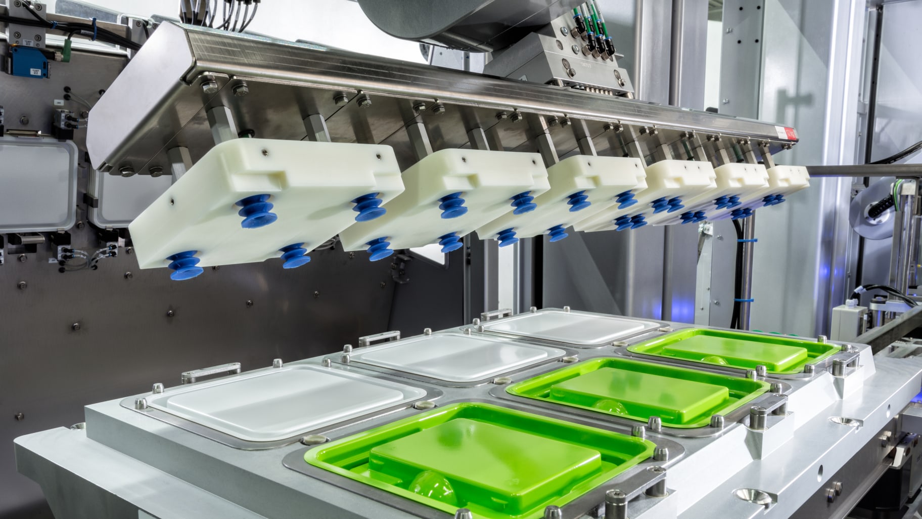 Eine ausgezeichnete Siegelqualität zwischen Trays und Kartonzuschnitt wird durch das Ultraschallsiegeln mittels einer Blocksonotrode realisiert. Durch einfachere Handhabung und niedrigere Life-Cycle-Kosten lassen sich so langfristig Kosten sparen. Über das Schubert-Bedienterminal wird jede Blocksonotrode individuell und einfach parametriert. Die Einzelansteuerung der Blocksonotroden ermöglicht die qualitative Überwachung jeder Versiegelung. Unterschiedliche Größen der Siegelrandbeutel sowie weitere Traykavitäten und -farben können zügig gewechselt werden: Trotz unterschiedlicher Pflastergrößen muss lediglich das Beladewerkzeug am F2-Roboter umgestellt werden. Alle anderen Werkzeuge sind universell für alle Verpackungsgrößen ausgelegt, sodass keine Formatteile notwendig sind.